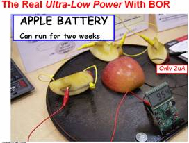 低功耗:便攜化就意味著產(chǎn)品將對(duì)待機(jī)時(shí)間提出更多需求。在CMET2009上,來(lái)自TI的 MSP430微控制器業(yè)務(wù)發(fā)展經(jīng)歷刁勇展示了MSP430家族令人吃驚的功耗特征:僅僅用三小塊蘋果制成的生物電池就可以帶動(dòng)MSP430正常工作一到兩個(gè)星期!