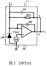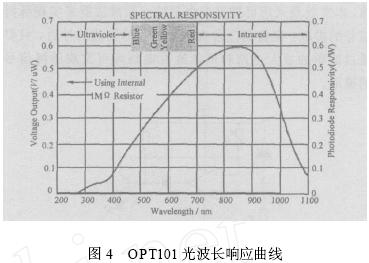在本文中, 采用一種新型的光敏元件OPT101 , 該元件將感光部件和放大器集成在同一個芯片內(nèi)部, 這種集成化的設(shè)計方式有效地克服了后端運算放大器空載電流輸出對光敏部件輸出電流的影響, 而且芯片輸出的電壓信號可以通過外部的精密電阻進行調(diào)節(jié), 有利于芯片適應(yīng)整體的電路設(shè)計, 同時芯片的集成化設(shè)計也能夠減小系統(tǒng)的功耗。
