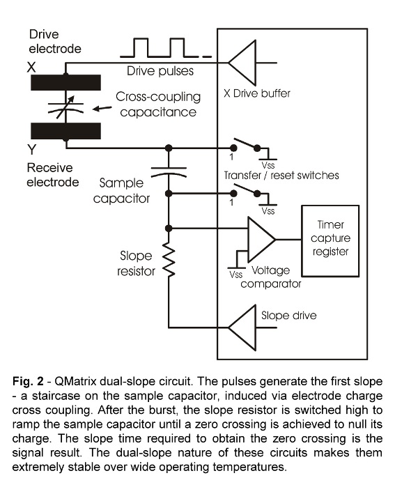 利用多條 X 驅動和 Y 接收線并將按鍵電極設置到交叉點上構成的多鍵矩陣,鍵盤按鍵會如機電鍵盤般按時順序掃描。QMatrix 電極可以感測任何介電材料,如厚度高達 50mm 的玻璃或塑料,取決于電極的大小和脈沖串長度 (增益) 的設置。