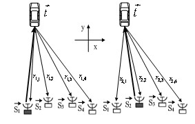 對(duì)于本文所討論的雷達(dá)網(wǎng)絡(luò)系統(tǒng)而言,四個(gè)近距離雷達(dá)傳感器即是發(fā)射機(jī)又是接收機(jī)。如圖6所示,通過(guò)電掃開(kāi)關(guān)的控制,其中的一個(gè)NDS擔(dān)當(dāng)發(fā)射機(jī),反射信號(hào)被四個(gè)NDS同時(shí)接收。經(jīng)過(guò)信號(hào)處理之后,因各個(gè)NDS之間位置的不同,可以得到四組關(guān)于被測(cè)目標(biāo)的距離和相對(duì)速度值(r1,1v1,1)、(r1,2v1,2)、(r1,3v1,3)、(r1,4v1,4)。這種采用單基地發(fā)射多基地接收的雷達(dá)網(wǎng)絡(luò)體制,盡管對(duì)傳感器之間的時(shí)間同步控制要求很高,但是可以避免鄰近傳感器之間的相互干擾。
