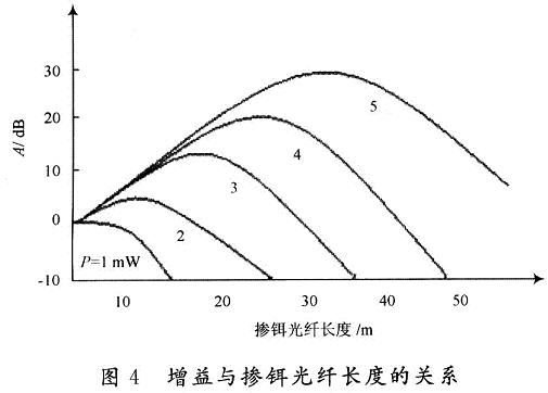 由于摻鉺光纖本身的損耗,造成信號光中被吸收掉的光子多于受激輻射產(chǎn)生的光子,引起增益下降。由上述討論可知,對于某個確定的入射泵浦功率,存在著一個摻鉺光纖的最佳長度,使得增益最大。增益與摻鉺光纖長度的關(guān)系如圖4所示。