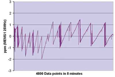 如圖2所示,此處給出的短期穩(wěn)定度數(shù)據(jù)是在8分鐘內(nèi)每隔0.1s測量穩(wěn)定在25℃(誤差僅零點幾度)的振蕩器的頻率值。各部分均由安捷倫53152頻率計數(shù)器測試,該計數(shù)器利用銣原子頻率標準參考源進行工作。頻率變化以第一次讀數(shù)的百萬分率為單位顯示在圖中。