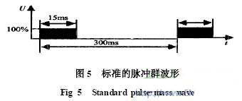 電磁兼容設(shè)計(jì)靠電磁兼容試驗(yàn)來(lái)驗(yàn)證與改進(jìn)?,F(xiàn)在,有了比較完善的電磁兼容試驗(yàn)方法和專(zhuān)門(mén)的試驗(yàn)設(shè)備。開(kāi)關(guān)電器動(dòng)作時(shí),形成強(qiáng)烈的干擾,產(chǎn)生瞬態(tài)脈沖。IEC61000-4-4標(biāo)準(zhǔn)對(duì)電快速瞬變脈沖干擾作出規(guī)定,分為單個(gè)脈沖、一群脈沖、脈沖群。脈沖群波形如圖5所示,周期為300ms,脈沖束寬度為15ms。