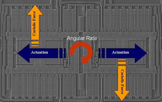 ST陀螺儀的核心元件是一個微加工機械單元,在設(shè)計上按照一個音叉機制運轉(zhuǎn),利用科里奧利原理把角速率轉(zhuǎn)換成一個特定感應(yīng)結(jié)構(gòu)的位移。我們以一個單軸Z軸陀螺儀為例,探討最簡單的工作原理(圖1)。兩個正在運動的質(zhì)點向相反方向做連續(xù)運動,如藍色箭頭所示。只要從外部施加一個角速率,就會出現(xiàn)一個科里奧利力,力的方向垂直于質(zhì)點運動方向。產(chǎn)生的科里奧利力使感應(yīng)質(zhì)點發(fā)生位移,位移大小與所施加的角速率大小成正比。因為,傳感器感應(yīng)部分的運動電極(轉(zhuǎn)子)位于固定電極(定子)的側(cè)邊,上面的位移將會在定子和轉(zhuǎn)子之間引起電容變化,因此在陀螺儀輸入部分施加的角速率被轉(zhuǎn)化成一個專用電路可以檢測的電參數(shù)。