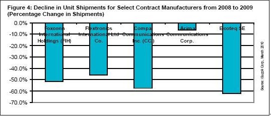 圖4:部分合同制造商2008至2009年單位出貨量下降情況(出貨量的百分比變動)