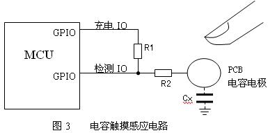 實(shí)現(xiàn)電路如圖3,使用一個I/O口對PCB構(gòu)成的電容充電,另一個I/O口測量電壓,對于多個按鍵時使用同一個I/O口充電。R1通常為幾百K到幾M,人體與PCB構(gòu)成的電極電容一般只有幾個pF,R2用于降低噪聲干擾,通常為10K。