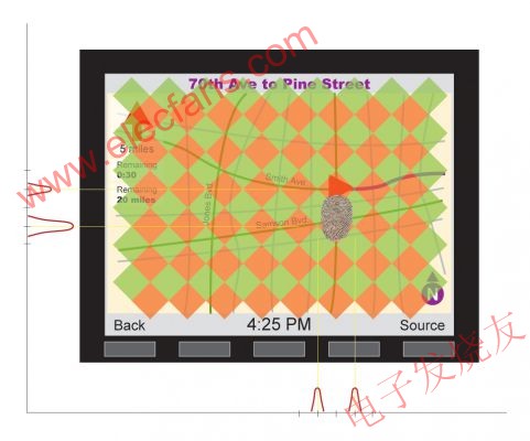 通過比較當(dāng)前基于電阻式觸摸屏和帶手勢(shì)識(shí)別的電容式觸摸屏的汽車HMI概念,我們可以發(fā)現(xiàn),新增手勢(shì)識(shí)別功能后,駕駛?cè)藛T對(duì)路面的關(guān)注程度在某些方面有所改善。通過電容式觸摸屏的手勢(shì)識(shí)別不僅是一種新的輸入方式,更使系統(tǒng)輸入提升到了一個(gè)新的層次。采用電容式觸摸屏,駕駛?cè)藛T仍然可以通過點(diǎn)擊瀏覽菜單結(jié)構(gòu),滑動(dòng)手指提高音量或者調(diào)節(jié)HVAC風(fēng)扇速度。不過,真正重要的是其控制標(biāo)準(zhǔn)功能的簡(jiǎn)易度,比如控制駕駛過程中非常必要的導(dǎo)航功能。用戶不必緊盯著屏幕,只需一個(gè)簡(jiǎn)單的手勢(shì)即可實(shí)現(xiàn)縮小操作。屏幕上的任何區(qū)域都可以感知手勢(shì),因此駕駛?cè)藛T不必把手指放在特定的位置來完成操作。圖1顯示就是這種導(dǎo)航屏幕上的動(dòng)作感知說明。