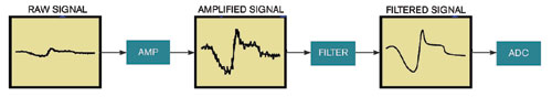 圖2,傳感器的信號路徑中包括放大器、濾波器和ADC。濾波器的設(shè)計(jì)用于去除信號中的噪聲,限制帶寬。