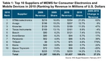 2010年TriQuint在該領(lǐng)域的營(yíng)業(yè)收入劇增778.6%,達(dá)到7470萬美元,而2009年只有區(qū)區(qū)850萬美元。TriQuint在該市場(chǎng)的排名因而從2009年的第16竄升至第8。意法半導(dǎo)體在10大廠商中的增長(zhǎng)率排名第二,其營(yíng)業(yè)收入大增63.5%,從2009年的2.163億美元上升到3.536億美元,擴(kuò)大了在全球消費(fèi)與移動(dòng)MEMS銷售額方面的領(lǐng)先優(yōu)勢(shì)。