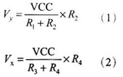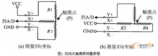 觸摸層的兩個金屬導電層分別用來測量X軸和Y軸方向的坐標。用于X坐標測量的導電層從左右兩端引出兩個電極,記為X+和X-。用于Y坐標測量的導電層從上下兩端引出兩個電極,記為Y+和Y-。這就是四線電阻觸摸屏的引線構成。當在一對電極上施加電壓時,在該導電層上就會形成均勻連接的電壓分布國。若在X方向的電極對上施加一確定的電壓,而Y方向電極對上不加電壓時,在X平行電壓場中,觸點處的電壓值可在在Y+(或Y-)電極上反映出來,通過測量Y+電極對地的電壓大小,便可得知觸點的X坐標值。同理,當在Y電極對上加電壓,而X電極對上不加電壓時,通過測量X+電極的電壓,便可得知觸點的Y坐標。測量原理如圖1所示。