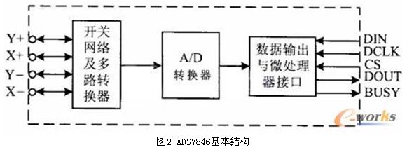 觸摸屏控制器有多種,主要的功能均是在微處理器的控制下向觸摸屏的兩個方向分時施加電壓,并將相應的電壓信號傳送給自身A/D轉(zhuǎn)換器,在微處理器SPI口提供的同步時鐘作用下將數(shù)字信號讀入微處理器??刂破鰽DS7846基本結構如圖2所示。