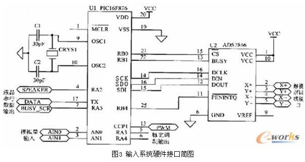 根據(jù)ADS7846與微控制器進行數(shù)據(jù)交換的接口特征,選用PIC16F876的SPI口。SPI口包括三個信號:SDO(串行數(shù)據(jù)輸出),SDI(串行數(shù)據(jù)輸入),SCK(串行同步時鐘)。硬件連接關系見圖3。