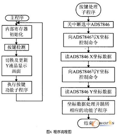 按照以上設計思想設計了應用軟件,圖4為主程序與觸摸屏輸入檢測部分的程序流程圖。其中,坐標數(shù)據(jù)處理通常采用查表的方法,將用戶命令的坐標形成數(shù)據(jù)表,利用獲得的坐標信息進行變換快速查表,從而提高軟件的運行速度。