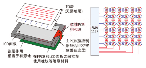 圖5:使用FMA1127實(shí)現(xiàn)的觸摸屏及PCB和觸摸屏的疊層安排。利用TDC比較由檢測(cè)電容形成RC延時(shí)線與基準(zhǔn)RC延時(shí)線的延時(shí)差別。使用差動(dòng)信號(hào)消除或降低了相關(guān)/相干噪聲源的影響,無需地層。