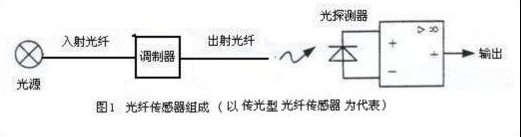 光纖傳感器一般是由光源、接口、光導(dǎo)纖維、光調(diào)制機構(gòu)、光電探測器和信號處理系統(tǒng)等部分組成。來自光源的光線,通過接口進(jìn)入光纖,然后將檢測的參數(shù)調(diào)制成幅度、相位、色彩或偏振信息,最后利用微處理器進(jìn)行信息處理。概括光纖傳感器一般由三部分組成,除光纖之外,還必須有光源和光探測器兩個重要部件,見圖1所示。