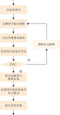 壓電式爆震傳感器的線性度檢測(cè)主要通過(guò)連續(xù)改變振臺(tái)的振動(dòng)頻率,即采用掃頻的方式,將振臺(tái)的振動(dòng)加速度穩(wěn)定在設(shè)定范圍內(nèi),對(duì)各個(gè)頻率下的傳感器靈敏度進(jìn)行檢測(cè),輸出各個(gè)靈敏度與頻率相對(duì)應(yīng)的連續(xù)曲線,并檢測(cè)該曲線是否符合該傳感器產(chǎn)品的線性度要求,其測(cè)試流程如圖1所示。