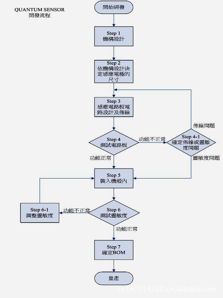 使用電容式感應(yīng)的IC設(shè)計(jì)感應(yīng)開關(guān)電路板與其它電路的開發(fā)流程略有不同,因?yàn)殡娙菔介_關(guān)的設(shè)計(jì)上會(huì)受到機(jī)構(gòu)與其它電路設(shè)計(jì)上的影響,會(huì)有比較多的調(diào)整程序,所以需要一個(gè)比較復(fù)雜的開發(fā)流程,現(xiàn)就以出道較早且具有代表性的“Quantum ”產(chǎn)品的開發(fā)流程及要點(diǎn)介紹給大家,希望對(duì)需要的朋友有所幫助。下圖是開發(fā)流程圖: