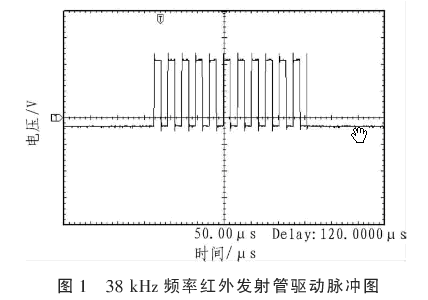 發(fā)射管選取SIR204-A型發(fā)射管,該紅外線二極管驅(qū)動電流范嗣為20~100 mA,其正向?qū)▔航禐?.3~1.5 V,發(fā)出紅外線光波長范圍約為835~930 nm,發(fā)射角度為30°,直射時紅外線光強度最大。發(fā)射管驅(qū)動電壓采用脈沖電壓,38 kHz載波頻率,發(fā)送時長為280 μs,占空比為1/2的方波,發(fā)送間隔為720 μs。載波脈沖需要與紅外線接收管的型號相匹配。紅外發(fā)射管能夠匹配光電晶體管、光敏二極管和紅外接收器模塊,紅外傳感器的接收部分選擇了帶有放大和濾波功能的紅外線接收二極管。發(fā)射部分的設(shè)計需要考慮到接收部分的制約。經(jīng)過驗證調(diào)制脈沖驅(qū)動電流能夠匹配紅外線接收管,將紅外線接收管導通。驅(qū)動發(fā)射管PWM的波形如圖1所示。