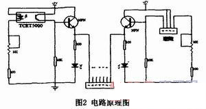 具體電路設(shè)計(jì)見圖2。以圖左半部分為例,當(dāng)TCRT5000下面無黑線時,紅外線能正常反射,接收管可以接收到信號并導(dǎo)通,此時NPN三極管導(dǎo)通,指示燈亮并向單片機(jī)提供高電平。反之當(dāng)光電傳感器下面有黑線時,NPN三極管關(guān)斷,單片機(jī)得到低電平信號。通過調(diào)節(jié)102的可調(diào)電阻,可以調(diào)整發(fā)射強(qiáng)度,下面100Ω電阻作為防燒毀的限流電阻。這是一張簡化的原理圖,圖中左半部的電路同樣可以視需要的尋跡器個數(shù)擴(kuò)展任意多個。本設(shè)計(jì)用五只TRCT5000來尋跡,對應(yīng)輸給單片機(jī)插口的7-3號腳,這樣可分別接避障模塊和路程檢測模塊。