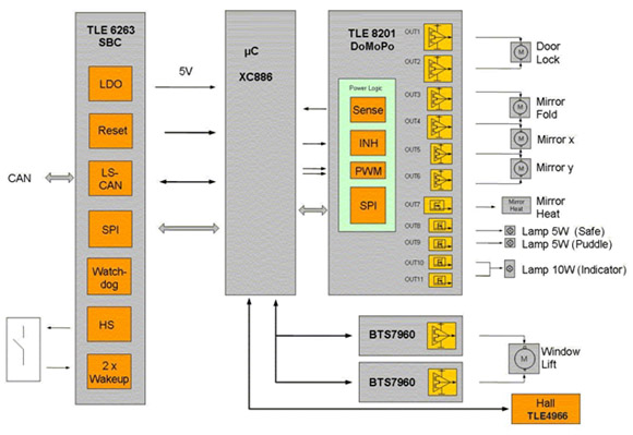 圖3: 采用TLE8201R的一個(gè)完整車門模塊的框圖。