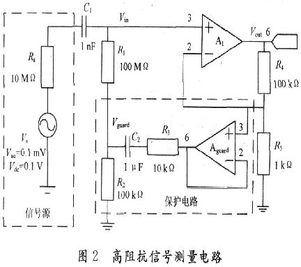 圖2中下側(cè)虛線框內(nèi)的電路為保護(hù)電路,從放大器A1的反相輸入端引入信號(hào)到保護(hù)放大器Aguard的正相輸入端,保護(hù)放大器實(shí)則為電壓跟隨器。電阻R1的低電位端加上保護(hù)電位Vguard,當(dāng)R2>>R3時(shí)。在一定頻率范圍內(nèi),保護(hù)電位近似等于高阻抗輸入端電位Vin,可以通過(guò)調(diào)節(jié)R2,R3的阻值來(lái)改變保護(hù)電位的大小。保護(hù)電位由保護(hù)緩沖放大器提供,而不是由信號(hào)源提供.電阻R1的低阻抗端加上保護(hù)電位后,其電壓降將大大減小,流經(jīng)它的電流也將大大減小。