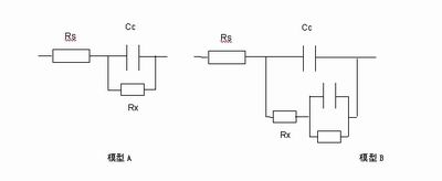 在模型A中電阻器Rs表示金屬所在的溶液,而電容Cc表示金屬表面的保護涂層或涂料,這表示初始涂層的電容。經(jīng)過一段時間后,水滲入涂層中形成新的液體和金屬界面。隨著金屬的腐蝕,通過溶液與金屬之間的保護涂層形成離子導(dǎo)電路徑。這可以用Rx與Cc并聯(lián)模型來表示。另外,有些模型(模型B)還有一個附加的R和C并聯(lián)起來再與Rx串聯(lián)的電路來表示金屬保護涂層隨著時間變化的分層模型。