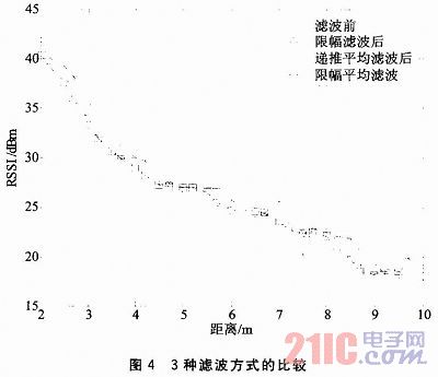 紅外線、GPS和超聲測距都需要額外的硬件,增加了節(jié)點的硬件成本和尺寸。GPS和紅外線測距誤差較大,而利用超聲方法測距很精確,測距誤差只有10 cm,但是受氣溫、濕度等的影響較大,不適合在室外使用?;赗SSI的定位無需額外硬件,利用對接收無線信號的強度判斷,推導收發(fā)節(jié)點間的距離,計算接收無線信號強度是商用無線收發(fā)芯片具備的功能?;赗SSI的測距提供了最廉價的定位方法,而且節(jié)點沒有添加任何部件?;诔暤臏y距雖然定位精度較高,但是需要添加硬件、增加節(jié)點成本和尺寸。所以,基于RSSI的測距是無線傳感器網(wǎng)絡定位較常采用的方法。首先對RSSI進行預處理,再通過預測模型預測距離的值,不但提高了基于RSSI的測距精度,而且實現(xiàn)了低成本的測距。
