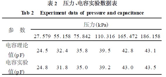從表1 可見,擬合的電容誤差小于1 %。由此可見,在不同的時(shí)刻測得UO ( t) ,通過曲線擬合得出參數(shù)RC。再給電路加小信號直流電源,測出R 值,即求得C ,通過C 值則可知被測環(huán)境的壓力。圖5為350 ℃時(shí),不同的壓力所對應(yīng)的電容的理論值和實(shí)驗(yàn)值,從實(shí)驗(yàn)數(shù)據(jù)(表2) 可得,在測壓的過程中,利用模型識別的方法,誤差較小,其測壓誤差小于2 %。