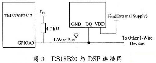 DSl8B20與DSP連接主要有兩種方式:寄生電源方式和外部供電方式。本文采用外部供電方式,其中18B20的DQ口與F2812的GPIOA0口連接,具體連接如圖3所示。