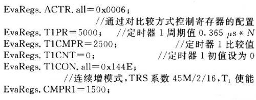 TMS320的事件管理模塊總共能輸出16路PWM信號,文中僅需要輸出一路占空比可調(diào)的PWM信號,并設(shè)計從PWMl引腳輸出該方波信號。文中選用通用定時器1(T1)作為時基;全比較單元1保存調(diào)制值;計數(shù)方式采用連續(xù)增計數(shù)模式。PWM占空比值與T1的三角波數(shù)據(jù)比較,輸出PWM信號控制半導(dǎo)體制冷片工作。各寄存器設(shè)置如下(高速外設(shè)時鐘為22.5 MHz):