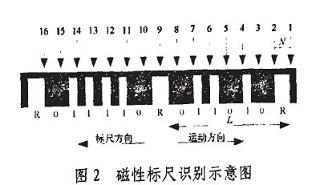 根據(jù)磁敏傳感原理,“凹槽”和“凸槽“會導(dǎo)致不同的磁場強(qiáng)度,從而使磁敏元件相應(yīng)地輸出不同的電半信號“0”或“1”,形成數(shù)值碼,用于確定位移的粗讀值;而標(biāo)志位R碼寬兩倍于碼元“1”寬度的特點(diǎn),使得識別后的序列出現(xiàn)具有固定特征的標(biāo)識碼,它用于精讀數(shù)。