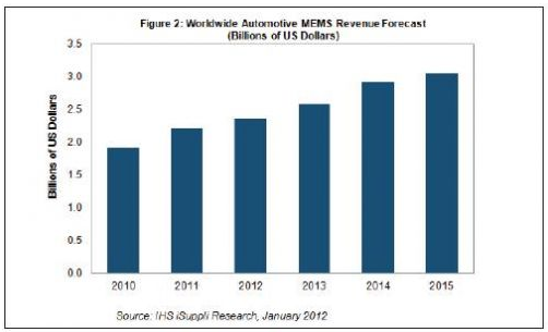 IHS公司認(rèn)為,由于2012年下半年末期廠商削減庫存,預(yù)計(jì)今年銷售額增長率將小幅下降,約為7%。但是,預(yù)計(jì)汽車出貨量增長6%,將抵消庫存下降的影響,而且安全規(guī)定的影響將上升。例如,電子穩(wěn)定控制(ESM)系統(tǒng)在每輛汽車MEMS傳感器價(jià)值中可以占到15美元左右。