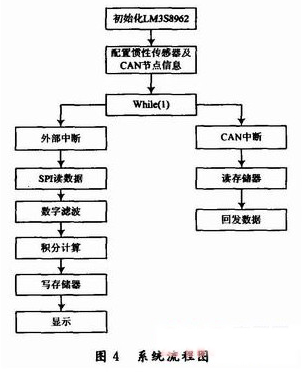 傳統(tǒng)研究方法是先建立數(shù)學(xué)模型,后期采用數(shù)據(jù)處理算法來糾正誤差。在慣性系統(tǒng)的應(yīng)用中,這不僅要求數(shù)學(xué)模型準(zhǔn)確可靠,而且普通的微控制器由于處理速度限制,而很難處理如此大的數(shù)據(jù)量,采用高性能DSP無疑增加了成本。為此,設(shè)計(jì)了以LM3S8962為核心處理器,以ADIS16365為慣性傳感器的慣性系統(tǒng)。該系統(tǒng)利用ADIS16365自身的數(shù)據(jù)處理功能對三軸角速度和角加速度數(shù)據(jù)進(jìn)行處理。在外部再經(jīng)過濾波與積分,得到了精確的角度信號,滿足了系統(tǒng)的可靠性和??刂埔蟆4送?,面對系統(tǒng)對慣性數(shù)據(jù)需求量的增多,將該慣性系統(tǒng)設(shè)計(jì)為一個(gè)CAN節(jié)點(diǎn)應(yīng)用于整個(gè)系統(tǒng)。