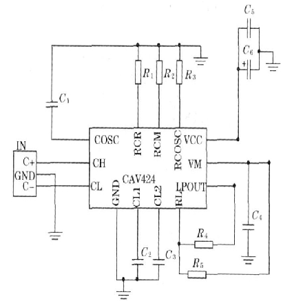 CAV424是專門用于電容檢測轉換的集成芯片, 其工作原理圖及外圍連接圖如圖1所示。