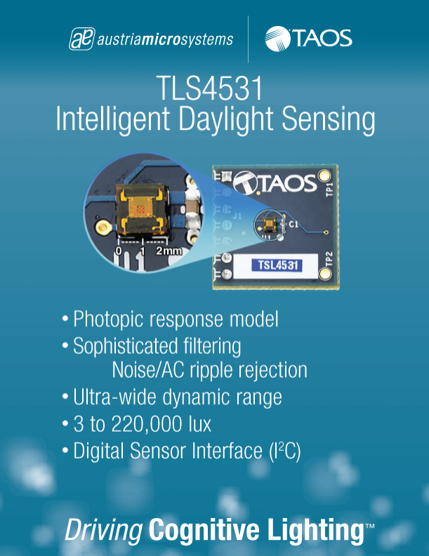 新的傳感器系列由2011年被奧地利微電子收購的全球領(lǐng)先智能照明傳感器提供商TAOS所研發(fā),可提供從3勒克斯至220,000勒克斯的動態(tài)范圍,可防止直射陽光下的傳感器輸出飽和,并通過運用適光反應(yīng)模型使傳感器的輸出與人眼的感知一致。