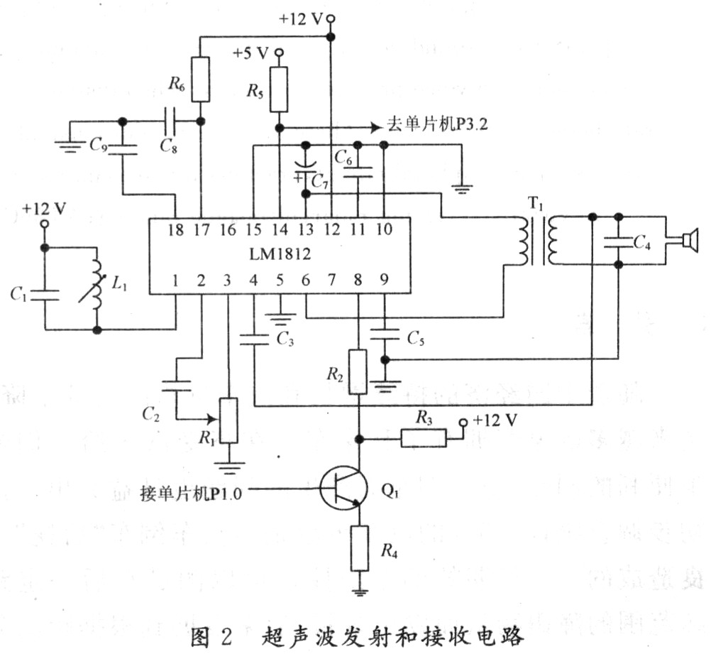 超聲波發(fā)射和接收電路如圖2所示。當LM1812的8腳為高電平時,LM1812處于發(fā)射模式;當8腳為低電平時,LM1812處于接收模式。值得注意的是,單片機到LM1812的連接要進行5~12 V的電平轉換。當LM1812處于發(fā)射模式時,L1,C1振蕩槽路被切換為振蕩模式,振蕩信號經(jīng)驅動放大后,由13腳及6腳輸出。6,13腳之間所接變壓器線圈的匝數(shù)比是根據(jù)TCF40-25TR1型收發(fā)一體式超聲波傳感器的阻抗來確定的。實驗證明,變壓器線圈的匝數(shù)比大約為4:1時可實現(xiàn)與超聲波發(fā)送器阻抗相匹配。超聲波接收器接收到的超聲波信號經(jīng)電容耦合由4腳輸入,再經(jīng)內(nèi)部兩級放大后同由1腳的諧振回路取出的信號一起送到檢測器。當檢測到超聲波回波信號時,LM1812的14腳(與單片機的INT0端相連)變?yōu)榈碗娖?,使單片機的T0計數(shù)器停止計數(shù)。