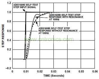 確定傳感器步進(jìn)響應(yīng)對于隔離在確定帶寬特性時(shí)觀察到的諧振條件很有用。圖1所示為一種采用ADIS16080的系統(tǒng)的頻率響應(yīng)。圖中所示諧振頻率為100 Hz。開始時(shí),該諧振到底是傳感器行為導(dǎo)致,還是系統(tǒng)中的機(jī)械諧振所導(dǎo)致,這并不清楚。幸運(yùn)的是,步進(jìn)響應(yīng)(如自測功能所確定)可以區(qū)分這兩種效應(yīng)。圖2顯示了兩種條件下的坐標(biāo)曲線圖:測試設(shè)置導(dǎo)致的諧振和傳感器本身導(dǎo)致的諧振。