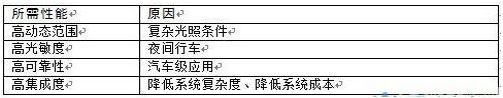 考慮到夜間行車(chē),有些道路沒(méi)有路燈或者路燈很暗,汽車(chē)視覺(jué)系統(tǒng)也需要在低光照?qǐng)鼍跋虏杉窙r信息。針對(duì)汽車(chē)應(yīng)用,圖像傳感器需要滿足一系列汽車(chē)級(jí)要求,如寬溫度范圍、高可靠性、高集成度、低成本等。表1總結(jié)了汽車(chē)視覺(jué)系統(tǒng)中圖像傳感器應(yīng)該具有的性能:
