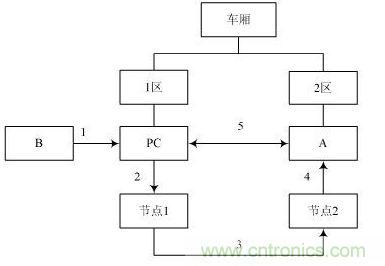 系統(tǒng)設計方案非常簡單。一般來講火車車廂全長26.6 m ,而無線傳感器網(wǎng)絡(wireless sensor net2works ,WSN)的通信距離在幾十米到幾百米之間,一般為30 m ,因此一個節(jié)點就可以完全覆蓋整個車廂。在系統(tǒng)中只有2個節(jié)點(不需PC協(xié)助) :節(jié)點1作為發(fā)信者,節(jié)點2作為收信者,組成最簡單的網(wǎng)絡,不需跳轉。系統(tǒng)的結構簡單,使得傳輸時延非常小,比較適合應用在上文中提到的場合。