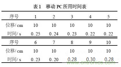 現(xiàn)在通過簡單實驗獲取數(shù)據(jù)來計算人為移動引起的az :隨意從桌上拿起筆記本,重復10次,記錄短距離10 cm)所用時間。得到10組數(shù)據(jù)如表1所示。
