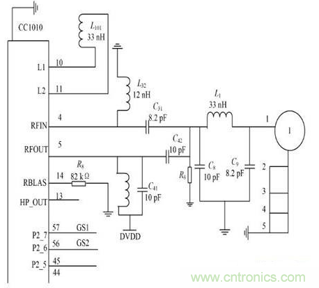 圖中, C31為輸入匹配電容, L32為輸入匹配電感,同時L32還用于阻止直流偏置信號的輸入; C41、C42和L41共同實現(xiàn)發(fā)射輸出電路的匹配。通過CC1010內部的發(fā)射/接收開關電路,使得收發(fā)器通過同一個50Ω的天線進行發(fā)射/接收操作。L1 , C8和C9組成一個低通濾波器,用以濾除高頻諧波,并且增加了頻率的選擇性,其阻抗為50Ω。元器件參數(shù)既可以按照CC1010datasheet上所給的值,也可利用SmartRF Studio軟件得到。