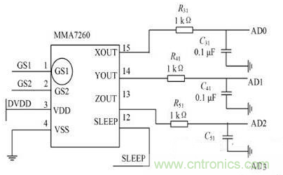 本無線采集系統(tǒng)采用了Freescale 公司最新推出的一款低成本、單芯片、三軸加速度傳感器MMA7260.該微型電容式加速傳感器融合了信號調理、單極低通濾波器和溫度補償技術,提供了4 種加速度測量范圍,分別為±1.5 g , ±2 g , ±4 g 和±6 g.考慮到前文將閾值定為0.2 g ,故設置參數(shù)將測量范圍定為±1.5 g.在CC1010 與MMA7260 的接口中,首先要考慮噪聲問題。因為MMA7260 內部采用了開關電容濾波器, 有時鐘噪聲產生, 所以需要在MMA7260 的XOU T ,YOU T 和ZOU T 三個輸出端分別接RC 濾波器;其次要考慮電壓匹配問題,由于x , y , z 軸方向的電壓輸出是0.45~2.85 V ,CC1010 的ADC 最大輸入范圍是0~V DD .此處,V DD = 3.3 V ,其范圍恰好在ADC的輸入范圍之內, 所以不用考慮額外的分壓電阻。CC1010 和MMA7260 的接口電路如圖3 所示。R31 / C31 , R41 / C41 , R51 / C51 用于濾除MMA7260 內部采樣的開關噪聲,GS1 ,GS2 用于量程選擇。