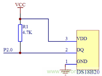 設(shè)計(jì)中采用支持“一線總線”接口、抗干擾性強(qiáng)、外部電路簡單、精確度高的DS18B20溫度傳感器對(duì)溫度的實(shí)時(shí)測(cè)量。其中,DS18B20 管腳2 即DQ 接在MSP430F149 的P2.0管腳,如圖所示。