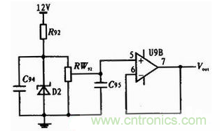 圖1中D2為穩(wěn)壓管,9V電源選用額定擊穿電壓為9.1 V的1N4696,1 V電源選用額定擊穿電壓為1.2 V的LM385;RW92是電位器,和穩(wěn)壓管并聯(lián)起到分壓的作用,滑動(dòng)頭分別可得到9 V和1 V的電壓;運(yùn)放在這里是電壓跟隨器,輸出電壓和電位器滑動(dòng)頭處的電壓大小相等;R92是限流電阻,和穩(wěn)壓管串聯(lián);兩個(gè)電容是退耦電容,大小0.1 μF,起到穩(wěn)定電壓的作用。為了不影響穩(wěn)壓管工作電阻阻值不大于500 Ω,電阻功率不小于1 W。電位器阻值不小于10 kΩ。