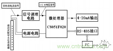 該系統(tǒng)的主要結(jié)構(gòu)框圖如圖1所示,主要由感應(yīng)式數(shù)字水位傳感器、信號(hào)調(diào)理電路、電源電路、MCU最小系統(tǒng)、4~20 mA輸出(AD421)、RS-485接口(MAX485),另外還包括PC,通過PC上位機(jī)監(jiān)控軟件實(shí)現(xiàn)網(wǎng)絡(luò)通信功能。