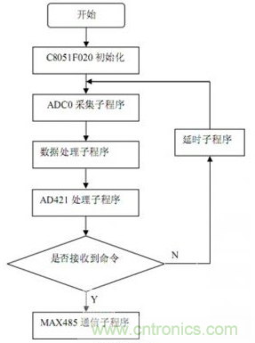 本系統(tǒng)采用C8051F020單片機(jī)為核心處理器件,把經(jīng)過調(diào)理電路處理的感應(yīng)式數(shù)字傳感器的電流信號(hào)經(jīng)模數(shù)轉(zhuǎn)換數(shù)字化,存入單片機(jī)內(nèi)部存儲(chǔ)器,并轉(zhuǎn)化為16位的數(shù)字信號(hào),一路送AD421轉(zhuǎn)化為4~20 mA標(biāo)準(zhǔn)電流信號(hào),進(jìn)行傳輸或控制;另外一路通過MAX485,在上位機(jī)查詢命令到達(dá)的時(shí)候發(fā)送上位機(jī),實(shí)現(xiàn)實(shí)時(shí)的監(jiān)控。本傳感器變送器系統(tǒng)軟件包括以下幾個(gè)部分:主程序、AD采集子程序、數(shù)據(jù)處理子程序、AD421轉(zhuǎn)化子程序、MAX485通信子程序,另外,根據(jù)需要可以加入報(bào)警子程序和其他的輔助程序等。整個(gè)系統(tǒng)如圖5所示。