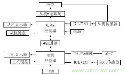 基本工作流程為:主機(jī)通過鍵盤設(shè)定自己和從機(jī)的液位,超聲波傳感器測出當(dāng)前水位對(duì)應(yīng)的電壓值,再經(jīng)過ICL7135 模數(shù)轉(zhuǎn)化送入控制器與設(shè)定值比較,單片機(jī)通過控制電磁閥調(diào)節(jié)主機(jī)液位,并把設(shè)定值與當(dāng)前值顯示在LCD 上;主機(jī)控制器通過485 通訊對(duì)從機(jī)控制器傳輸設(shè)定值,從機(jī)控制器也可以如主機(jī)控制器一樣對(duì)液位進(jìn)行控制,并通過LCD 顯示主機(jī)給定值與當(dāng)前液位值;并利用485 通訊把從機(jī)當(dāng)前液位傳送給主機(jī)顯示出來。