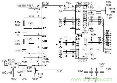 本電路由一個(gè)小型集成電路來實(shí)現(xiàn),采樣后的信號(hào)經(jīng)過電位器送到ICL7135 進(jìn)行處理,將處理后信號(hào)直接送到單片機(jī)最小系統(tǒng)。ICL7135 量程為0~2V,基準(zhǔn)電壓由MC1403 輸出(2.5V)分壓獲得1V 電壓。