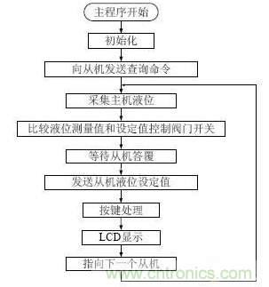 軟件部分主要是利用51 系列單片機(jī)作控制器,傳感器輸出電壓進(jìn)行采樣,將采樣值與設(shè)定值比較,單片機(jī)對(duì)電磁閥控制來調(diào)節(jié)液位,主機(jī)通過485 通訊給分機(jī)設(shè)定數(shù)值,分機(jī)控制器對(duì)分機(jī)液位進(jìn)行控制。軟件部分包括ICL7135 采樣部分、485 通訊部分、數(shù)字處理部分、顯示部分、鍵盤部分等。為了避免在傳感器移動(dòng)造成測量數(shù)據(jù)不準(zhǔn)確,特別增加了調(diào)零功能,進(jìn)一步提高了系統(tǒng)的準(zhǔn)確性。主程序流程圖如圖4 所示。