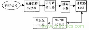 本設計的硬件電路主要由單片機89C51、計數(shù)器8253、細分與辨向電路、信號變換電路和光柵位移傳感器組成。如圖1所示。